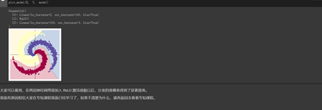 learning_rate = 1e-3 lambda_l2 = 1e-5 # 这里可以看到,和上面模型不同的是,在两层之间加入了一个 ReLU 激活函数 model = nn.Sequential( nn.Linear(D, H), nn.ReLU(), nn.Linear(H, C) ) model.to(device) # 下面的代码和之前是完全一样的,这里不过多叙述 criterion = torch.nn.CrossEntropyLoss() optimizer = torch.optim.Adam(model.parameters(), lr=learning_rate, weight_decay=lambda_l2) # built-in L2 # 训练模型,和之前的代码是完全一样的 for t in range(1000): y_pred = model(X) loss = criterion(y_pred, Y) score, predicted = torch.max(y_pred, 1) acc = ((Y == predicted).sum().float() / len(Y)) print("[EPOCH]: %i, [LOSS]: %.6f, [ACCURACY]: %.3f" % (t, loss.item(), acc)) display.clear_output(wait=True) # zero the gradients before running the backward pass. optimizer.zero_grad() # Backward pass to compute the gradient loss.backward() # Update params optimizer.step()