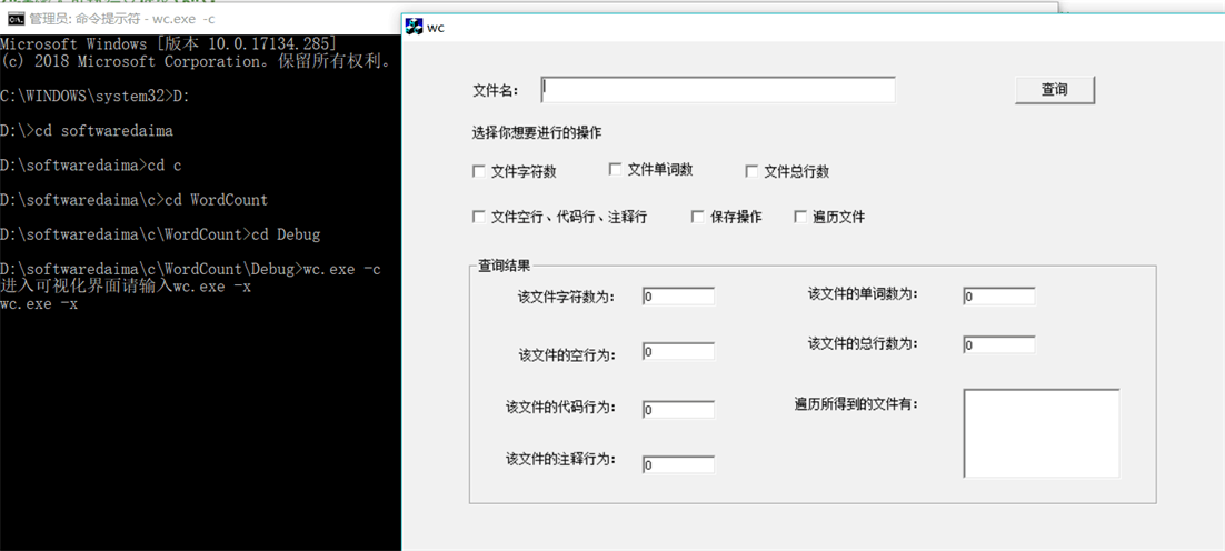 wc.exe -x //该参数单独使用,如果命令行有该参数,则程序会显示图形界面,用户可以通过界面选取单个文件,程序就会显示文件的字符数、单词数、行数等全部统计信息。