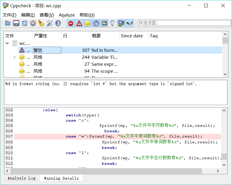 1 void printFile(char *file,int result,char type){ 2 FILE *wp; 3 if((wp=fopen("outputFile.txt","a"))==NULL){ 4 printf("文件不存在\n\n"); 5 }else{ 6 switch(type){ 7 case 'c': 8 fprintf(wp, "%s文件中字符数有%d", file,result); 9 break; 10 case 'w':fscanf(wp, "%s文件中单词数有%d", file,result); 11 fprintf(wp, "%s文件中单词数有%d", file,result); 12 break; 13 case 'l': 14 fprintf(wp, "%s文件中总行数数有%d", file,result); 15 break; 16 case 'f': 17 fprintf(wp, "%s文件中代码行数有%d", file,result); 18 break; 19 case 'e': 20 fprintf(wp, "%s文件中空行数有%d", file,result); 21 break; 22 case 'g': 23 fprintf(wp, "%s文件中注释数有%d", file,result);break; 24 default:; break; 25 } 26 } 27 fclose(wp); 28 }