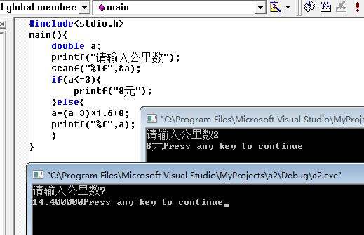 2编写程序,计算出租车行驶距离与费用之间的关系.起步3km内,8元;之后1.6元/km