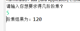 package a; import java.util.Scanner; public class aaa { public static void main(String[] args) { Scanner input=new Scanner(System.in); int sum=1; System.out.println("请输入你想要求得几阶阶乘?"); int a=input.nextInt(); for(int i=1;a>0;a--) { sum*=i; i++; } System.out.println("阶乘结果为:"+sum); } }