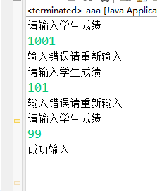 package a; import java.util.Scanner; public class aaa { public static void main(String[] args) { Scanner input=new Scanner(System.in); for(;;) { System.out.println("请输入学生成绩"); int score=input.nextInt(); if(score<100&&score>0) { System.out.println("成功输入"); break; } System.out.println("输入错误请重新输入"); } } }