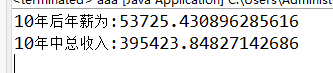 package a; public class aaa { public static void main(String[] args) { double earnings=30000; double rise=0.06; double sum=0; for(int i=1;i<=10;i++) { sum+=earnings; earnings+=earnings*rise; } System.out.println("10年后年薪为:"+earnings); System.out.println("10年中总收入:"+sum); } }