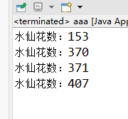 package a; public class aaa { public static void main(String[] args) { for(int i=100;i<=999;i++) { if(((i/100)*(i/100)*(i/100))+((i%10)*(i%10)*(i%10))+((i/10%10)*(i/10%10)*(i/10%10))==i) { System.out.println("水仙花数:"+i); } } } }