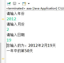 package a; import java.util.Scanner; public class aaa { public static void main(String[] args) { Scanner input=new Scanner(System.in); int flag=0; System.out.println("请输入年份"); int year=input.nextInt(); System.out.println("请输入月份"); int moon=input.nextInt(); System.out.println("请输入日期"); int day=input.nextInt(); System.out.println("您输入的为:"+year+"年"+moon+"月"+day+"天"); if(year%4==0&&year%100!=0||year%400==0) { flag=1;//flag=1为闰年 } int moon_day=0; int day_day=0; for(int i=1;i<moon;i++) { switch(i) { case 1: case 3: case 5: case 7: case 8: case 10: case 12: moon_day=31; break; case 2: if(flag==1) { moon_day=29; }else if(flag==0) { moon_day=28; } break; case 4: case 6: case 9: case 11: moon_day=30; break; } day_day+=moon_day; } day_day+=day; System.out.println("一年中的第"+day_day+"天"); } }