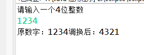 package aaa; import java.util.Scanner; public class a { public static void main(String[] args) { Scanner input=new Scanner(System.in); System.out.println("请输入一个4位整数"); int num=input.nextInt(); int num_q=num/1000; int num_b=num/100%10; int num_s=num/10%10; int num_g=num%10; System.out.println("原数字:"+num+"调换后:"+(num_g*1000+num_s*100+num_b*10+num_q)); } }