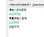 package Stringwork; import java.util.Scanner; //1.输入6位密码,再次输入密码,如果不够6位,提示,位数不对,如果两次不一致,提示两次密码不一致。 public class password { public static void pw() { Scanner input=new Scanner(System.in); String pass; String repass; System.out.println("请输入6位密码"); pass=input.next(); testfun_1(pass); System.out.println("请重新输入密码"); repass=input.next(); testfun_1(repass); testfun_2(pass,repass); } public static void testfun_2(String test,String retest) { if(!test.equals(retest)) { System.out.println("密码不一致"); System.exit(0); } } public static void testfun_1(String test) { if(test.length()!=6) { System.out.println("位数不对"); System.exit(0); } } public static void main(String[] args) { // TODO Auto-generated method stub pw(); } }