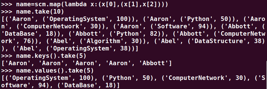 生成(姓名,课程分数)键值对RDD,观察keys(),values()