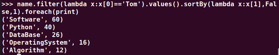 Tom的成绩按分数大小排序。filter(), map(), sortBy()