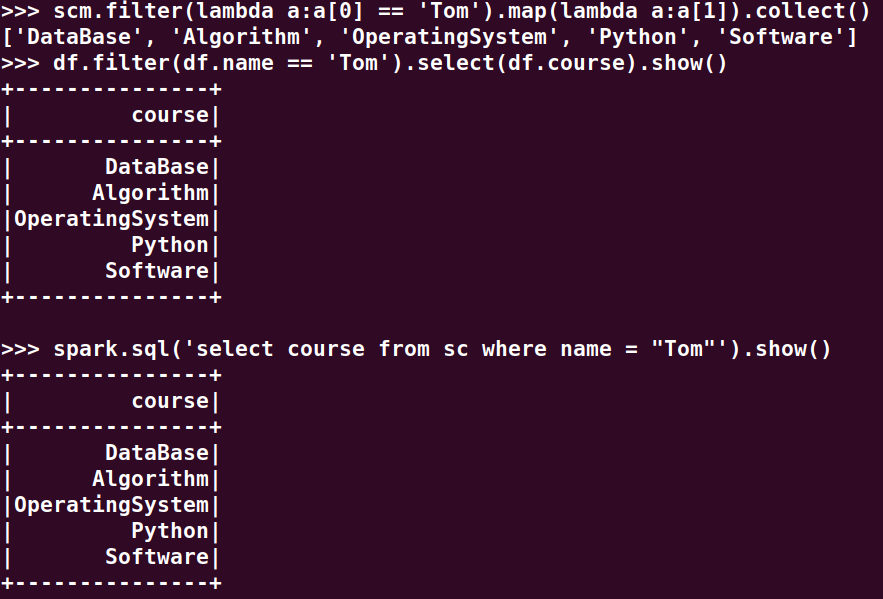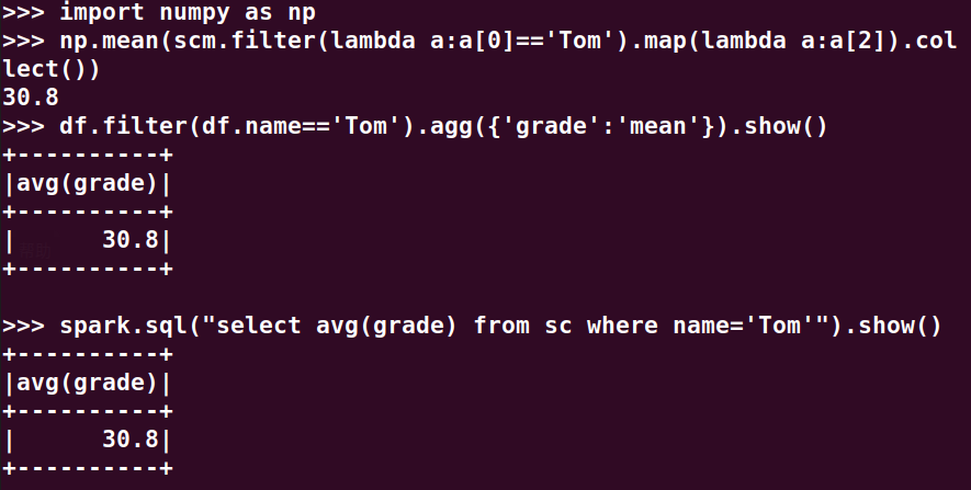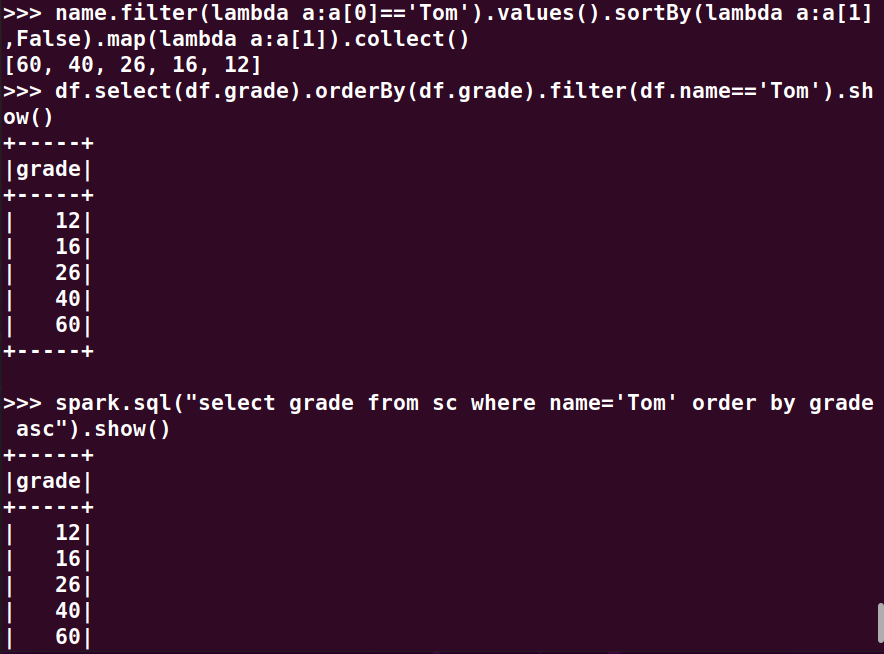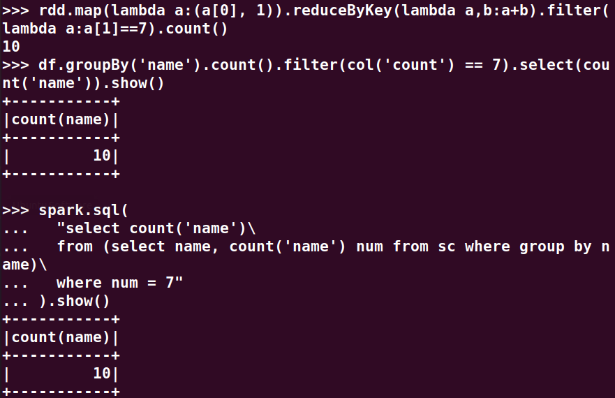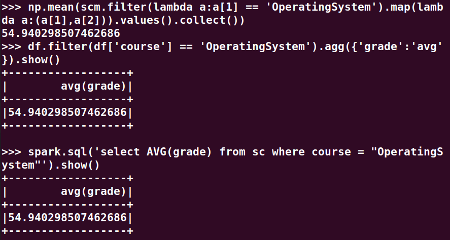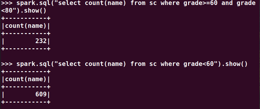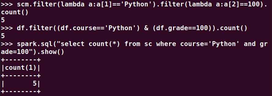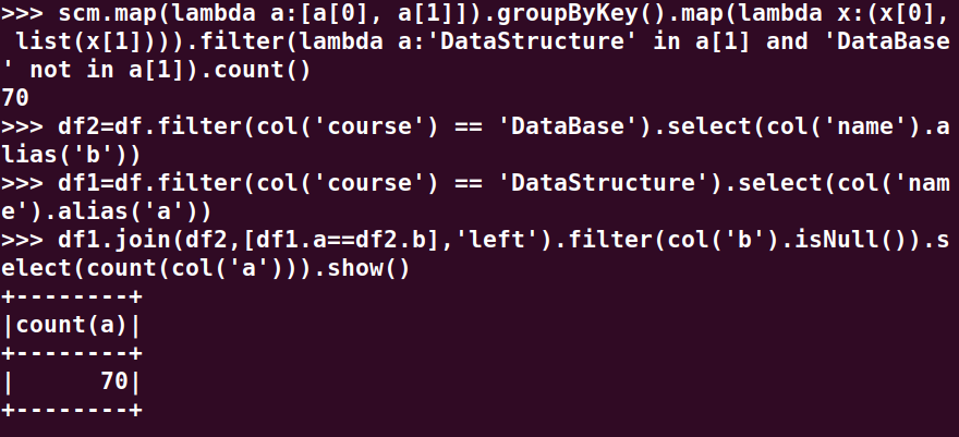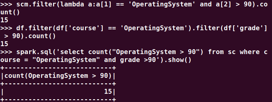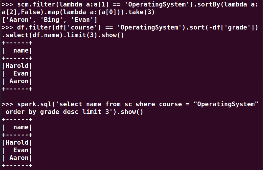 分别用RDD操作、DataFrame操作和spark.sql执行SQL语句实现以下数据分析: