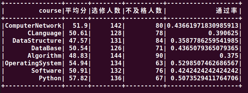 19.每门课的选修人数、平均分、不及格人数、通过率