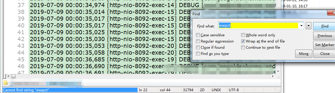 2:然后开始去线上找所有的服务器把日志都打开,进行搜索一开始搜索的服务器并没有相关报错的日志信息,继续找