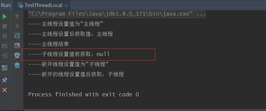 System.out.println("----子线程设置值前获取:" + threadLocal.get());