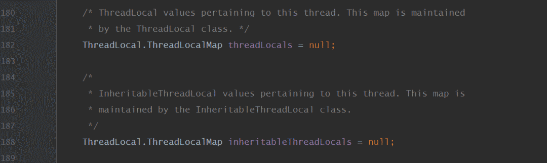 可以看到,InheritableThreadLocal其实也是用ThreadLocalMap去存放值,这点和ThreadLocal一样,只不过InheritableThreadLocal的变量在Thread类里的名字叫inheritableThreadLocals。我们进到Thread类中看这个变量。