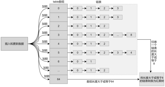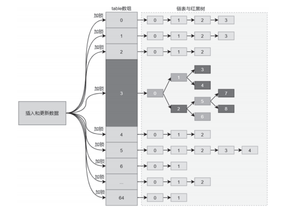 在ConcurrentHashMap中插入和更新数据时,会对table数组中的每一个节点都单独加锁,并且在数组中的每个节点下存储一个链表。