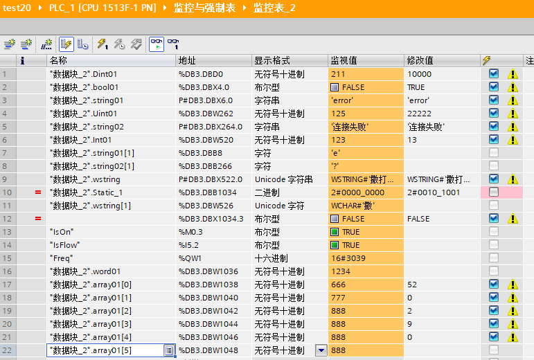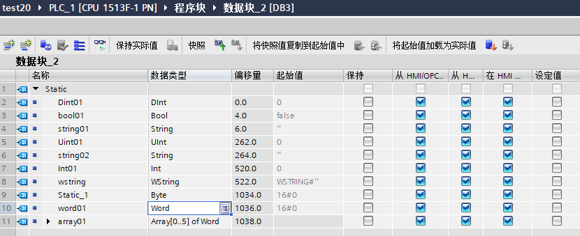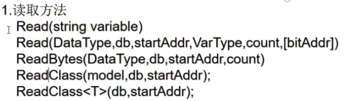 public class Plc2 { public int Dint01 { get; set; } public bool bool01 { get; set; } [S7String(S7StringType.S7String, 254)] public string string01 { get; set; }//前面2为长度,后面为内容 public short uint01 { get; set; } [S7String(S7StringType.S7String,254)] public string string02 { get; set; }//前面2为长度,后面为内容,如果存中文,直接读取为??????? public short int01 { get; set; } [S7String(S7StringType.S7WString, 254)] public string wstring { get; set; }//前面4为长度,后面为内容 public byte Static_1 { get; set; } public short word01 { get; set; } //word数组 public short array01 { get; set; } public short array02 { get; set; } public short array03 { get; set; } public short array04 { get; set; } public short array05 { get; set; } }