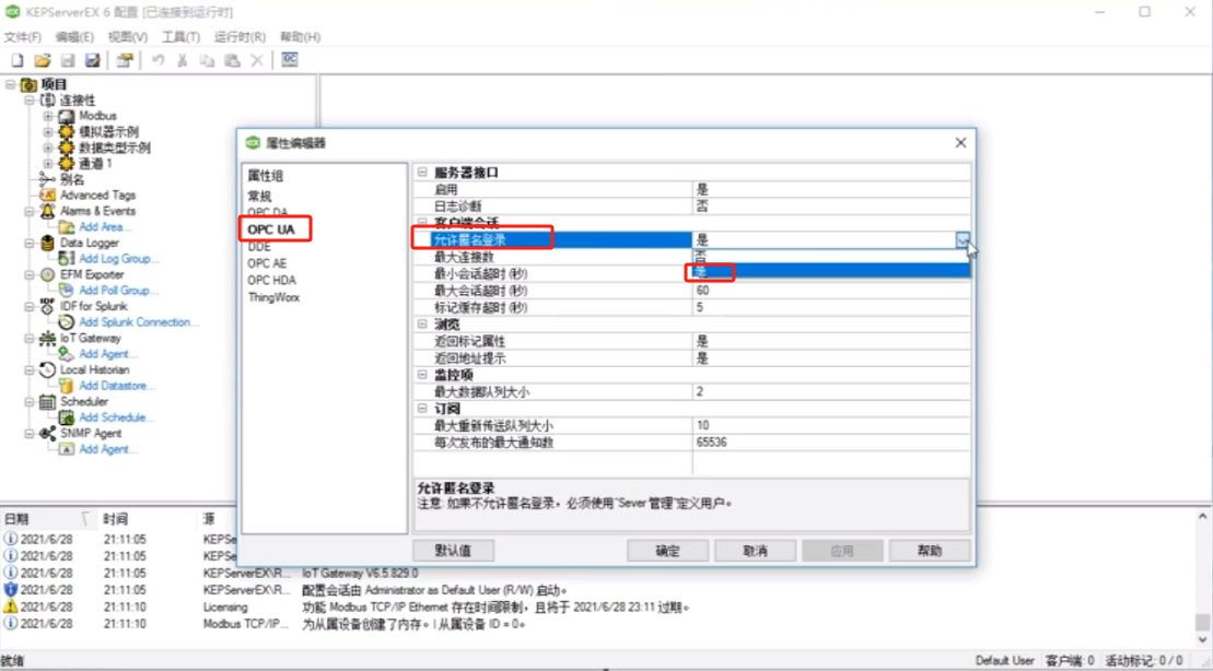 KEPServerEX 支持UA,自己学习可以打开运行匿名登录,默认否