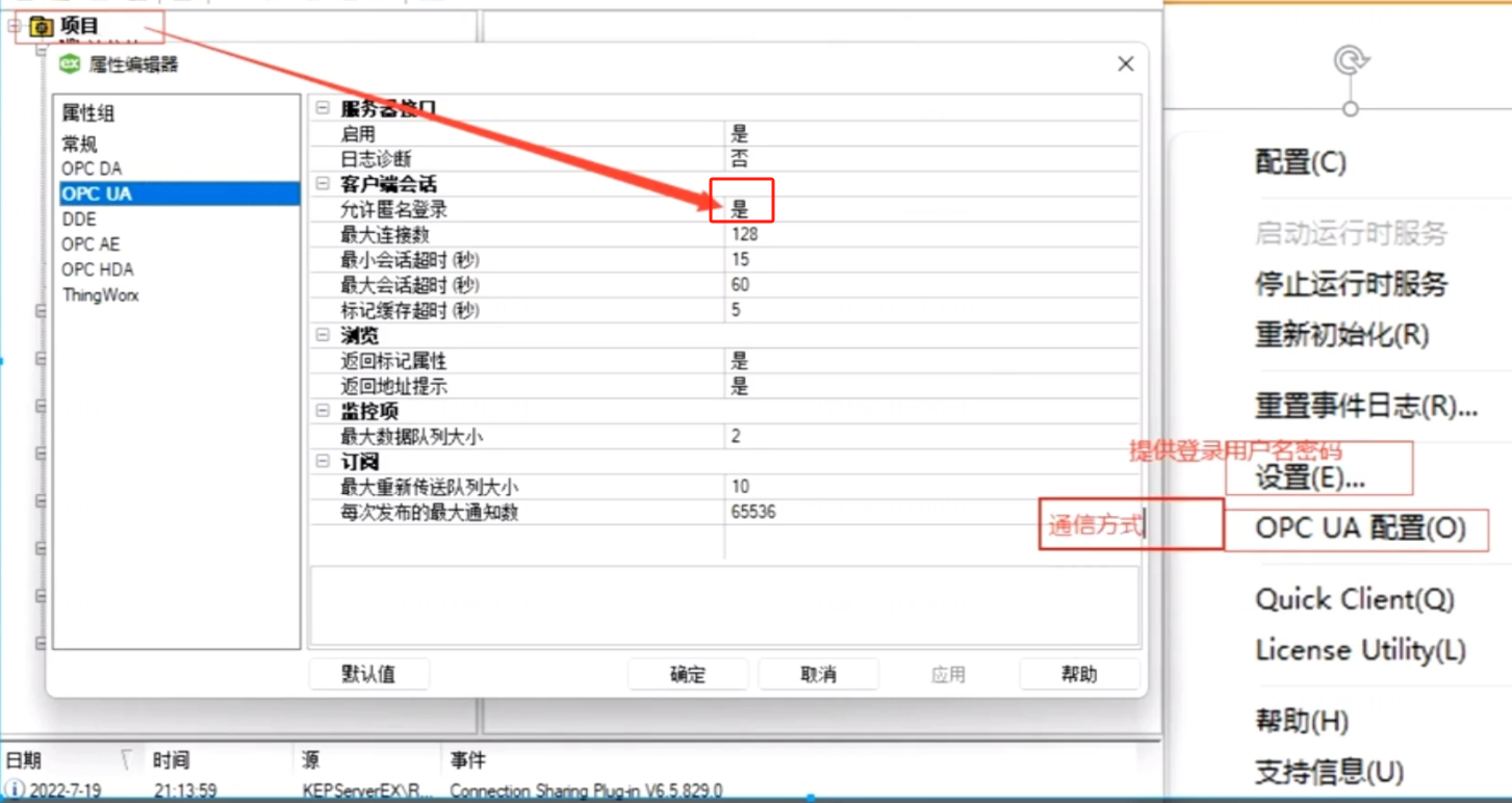 1、服务端,项目--右键属性--OPC UA 允许匿名登录:是