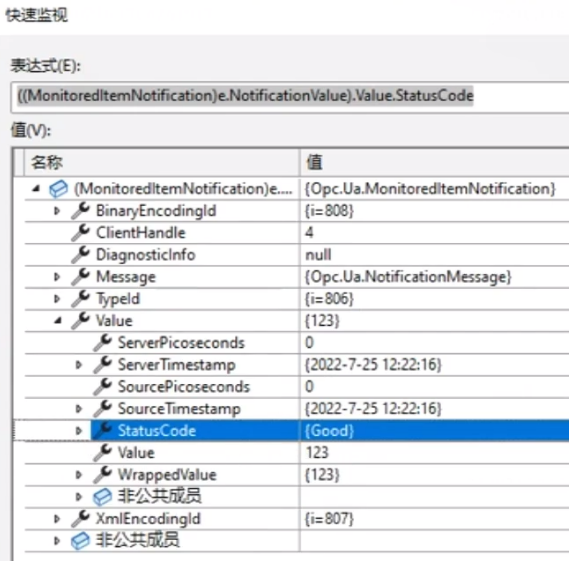 // 订阅 private static void Subscription(Session session) { Subscription subscription = new Subscription(session.DefaultSubscription);//参数订阅模板 MonitoredItem item = new MonitoredItem(); // ns=2;s=通道 1.设备 1.标记 2" item.StartNodeId = new NodeId("ns=2;s=通道 1.设备 1.标记 2");//也可以使用字符串 item.Notification += Item_Notification; subscription.AddItem(item); session.AddSubscription(subscription); subscription.Create();//添加完订阅动作之后,需要监听的节点添加到服务器里面 //session.RemoveSubscription(subscription); } private static void Item_Notification(MonitoredItem monitoredItem, MonitoredItemNotificationEventArgs e) { //e.NotificationValue }