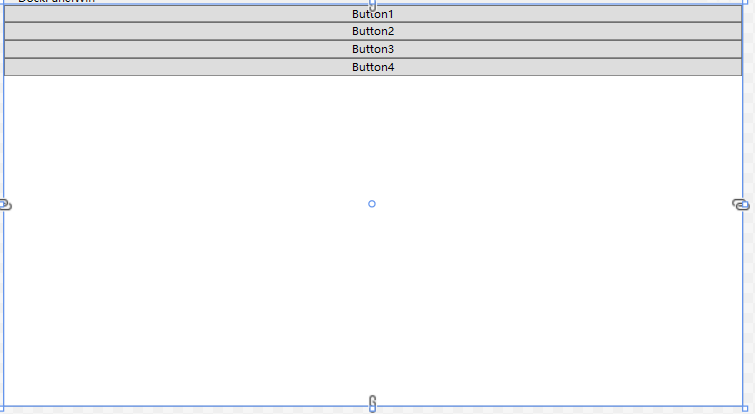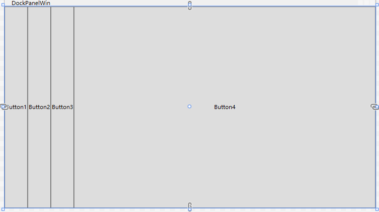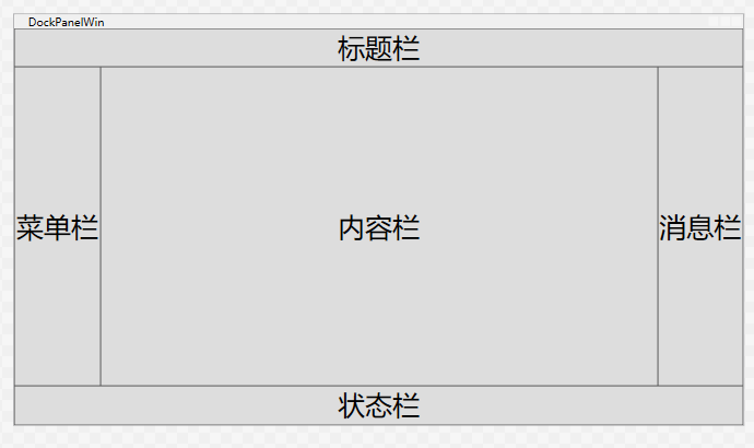 <DockPanel> <Button Content="标题栏" DockPanel.Dock="Top" /> <Button Content="状态栏" DockPanel.Dock="Bottom" /> <Button Content="菜单栏" /> <Button Content="消息栏" DockPanel.Dock="Right"/> <Button Content="内容栏" /> </DockPanel>