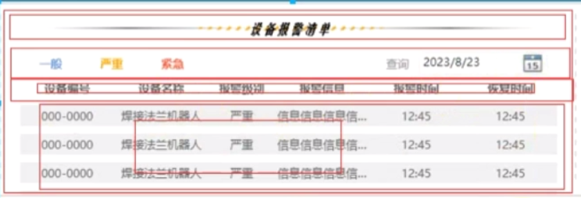<!--列头--> <Grid Grid.Row="2" TextBlock.Foreground="#555" TextBlock.FontWeight="Bold"> <Grid.ColumnDefinitions> <ColumnDefinition/> <ColumnDefinition/> <ColumnDefinition Width="70"/> <ColumnDefinition/> <ColumnDefinition Width="100"/> <ColumnDefinition Width="100"/> </Grid.ColumnDefinitions> <TextBlock Text="设备编号" VerticalAlignment="Center" HorizontalAlignment="Center"/> <TextBlock Text="设备名称" Grid.Column="1" VerticalAlignment="Center" HorizontalAlignment="Center"/> <TextBlock Text="报警级别" Grid.Column="2" VerticalAlignment="Center" HorizontalAlignment="Center"/> <TextBlock Text="报警信息" Grid.Column="3" VerticalAlignment="Center" HorizontalAlignment="Center"/> <TextBlock Text="报警时间" Grid.Column="4" VerticalAlignment="Center" HorizontalAlignment="Center"/> <TextBlock Text="恢复时间" Grid.Column="5" VerticalAlignment="Center" HorizontalAlignment="Center"/> </Grid>