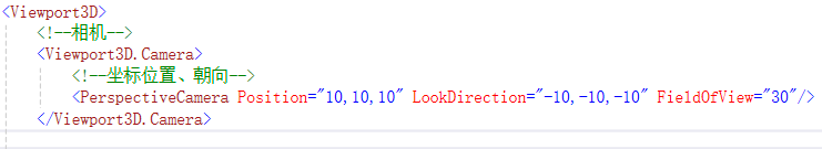<Viewport3D.Camera> <!--坐标位置、朝向--> <PerspectiveCamera Position="10,10,10" LookDirection="-10,-10,-10"/> </Viewport3D.Camera>