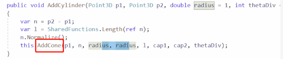private void HTCreate() { ModelUIElement3D modelUIElement3D = new ModelUIElement3D(); GeometryModel3D model3D = new GeometryModel3D(); modelUIElement3D.Model = model3D; // HelixToolkit工具包创建的3D对象 MeshBuilder meshBuilder = new MeshBuilder(); ////Point3D center, Box模型的中心位置 在xyz一半的位置 ////double xlength, ////double ylength, ////double zlength /// //// 添加一个立方体 3*4*5 1.5 2 2.5 //meshBuilder.AddBox(new Point3D(1.5, 2, 2.5), 3, 4, 5); // 添加一个圆球 // Point3D center, double radius = 1, int thetaDiv = 32, int phiDiv = 32 //meshBuilder.AddSphere(new Point3D(0, 0, 0), 3, 40);//球AddEllipsoid椭球 // 添加一个任意多边形 //List<Point3D> ps = new List<Point3D>(); //ps.Add(new Point3D(0, 0, 0)); //ps.Add(new Point3D(2, 0, 0)); //ps.Add(new Point3D(3, 5, 0)); //ps.Add(new Point3D(0, 1, 0)); //meshBuilder.AddPolygon(ps); // 添加一个圆柱 //Point3D p1, 圆柱的起点 //Point3D p2, 圆柱的终点 //double diameter, 圆柱的直径 //int thetaDiv 表面细分 ,表面的光滑度 // 最后两个参数:将圆柱两端密封起来(注意:这时候之前的直径参数变为半径) //meshBuilder.AddCylinder( // new Point3D(0, 0, 0), // new Point3D(0, 0, 4), // 1.5, // 40, true, false); // 添加一个锥形 //Point3D origin, 源点,起点 //Vector3D direction, 另一端的方向 //double baseRadius, 底座的半径 //double topRadius, 顶部的半径 //double height, 高度 //bool baseCap, 是否封底 //bool topCap, 是否封顶 //int thetaDiv 表面细分 meshBuilder.AddCone( new Point3D(0, 0, 0), new Vector3D(0, 0, 1), 2, 0, 5, true, true, 3 ); // 扫掠 指定一条线 沿着某个方向进行面的创建 // 自动创建 Positions / TriangleIndices,返回MeshGeometry3D MeshGeometry3D mesh = meshBuilder.ToMesh(); model3D.Geometry = mesh; DiffuseMaterial material = new DiffuseMaterial(); material.Brush = Brushes.Orange; model3D.Material = material; model3D.BackMaterial = material; this.viewport.Children.Add(modelUIElement3D); }