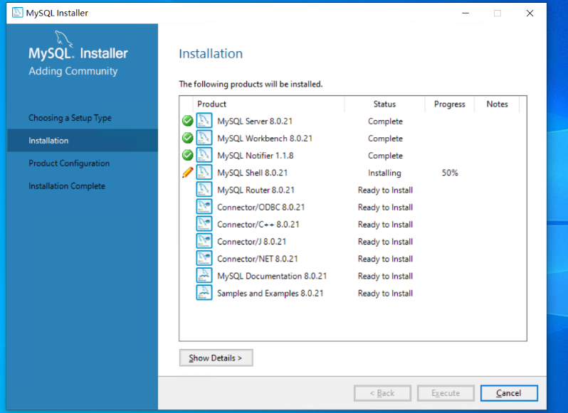 mysql-installer-community-8.0.21.0 右键安装 其他都默认第二步选择Execute执行