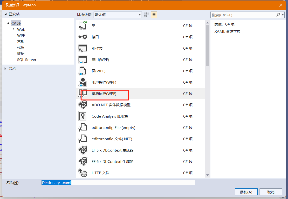 1、添加资源字典文件ResDictionary.xaml