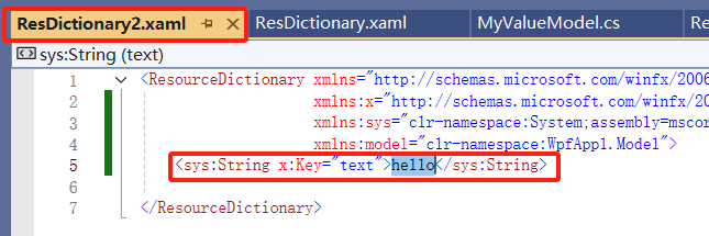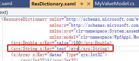 <ResourceDictionary xmlns="http://schemas.microsoft.com/winfx/2006/xaml/presentation" xmlns:x="http://schemas.microsoft.com/winfx/2006/xaml" xmlns:sys="clr-namespace:System;assembly=mscorlib" xmlns:model="clr-namespace:WpfApp1.Model"> <sys:Double x:Key="value">200</sys:Double> <x:Array x:Key="datas" Type="sys:Int32"> <sys:Int32>1</sys:Int32> <sys:Int32>2</sys:Int32> <sys:Int32>3</sys:Int32> <sys:Int32>4</sys:Int32> <sys:Int32>5</sys:Int32> </x:Array> <model:MyValueModel x:Key="my" MyProperty="123" Value="tom"/> </ResourceDictionary>