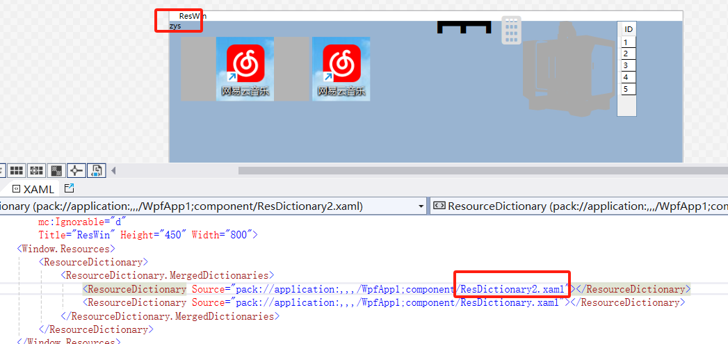 <Window.Resources> <ResourceDictionary> <ResourceDictionary.MergedDictionaries> <ResourceDictionary Source="pack://application:,,,/WpfApp1;component/ResDictionary.xaml"></ResourceDictionary> <ResourceDictionary Source="pack://application:,,,/WpfApp1;component/ResDictionary2.xaml"></ResourceDictionary> </ResourceDictionary.MergedDictionaries> </ResourceDictionary> </Window.Resources>