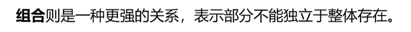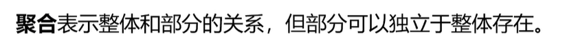 整体和部分的关系,一个类描述了一个较大的事物就是整体,它由较小的事物也就是部分组成。但部分可以独立于整体存在。