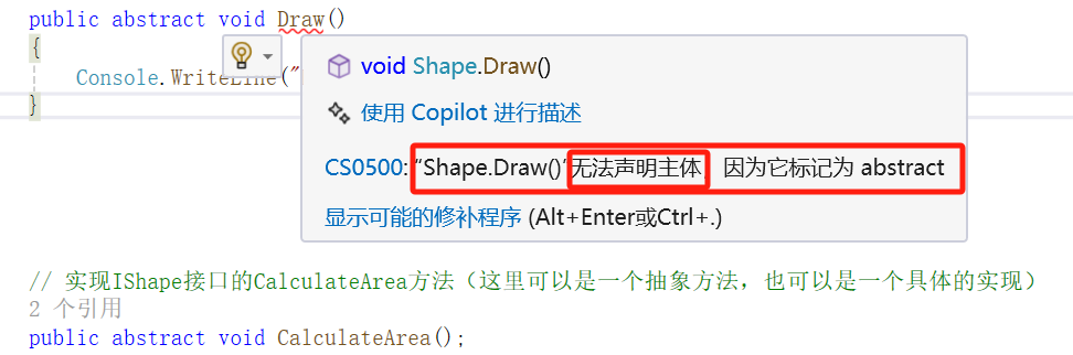 public interface IDrawable { void Draw(); } public interface IShape { void CalculateArea(); } public abstract class Shape : IDrawable, IShape { // 实现IDrawable接口的Draw方法 public virtual void Draw() { Console.WriteLine("Drawing a shape."); } // 实现IShape接口的CalculateArea方法(这里可以是一个抽象方法,也可以是一个具体的实现) public abstract void CalculateArea(); } public class Circle : Shape { public override void Draw() { Console.WriteLine("Drawing a circle."); } public override void CalculateArea() { Console.WriteLine("Calculating the area of a circle."); } }