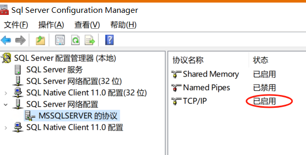 SQL Server Network Configuration->Protocols for MSSQLSERVER)。 -