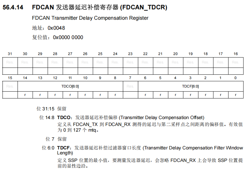 所以需要使用FDCAN_TDCR寄存器来设置在调整传输延迟补偿参数的范围。传输延迟补偿本身是硬件自动完成的。