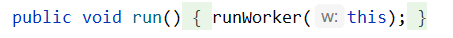 this.thread = getThreadFactory().newThread(this);从ThreadFactory中获得线程,并且把当前worker(this)传入了进去,所以当该线程start时,调用的也就是当前worker的run方法