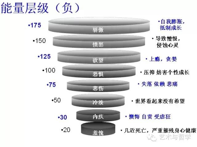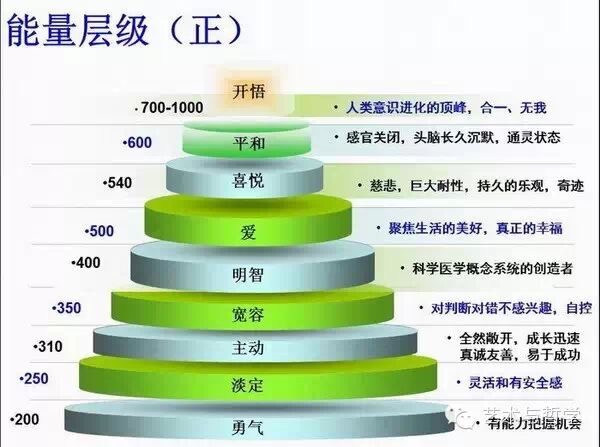 美国著名的精神科医师大卫·霍金斯(Dr. David R.Hawkins)的“能量级别论”研究告诉我们,善的能量级别高,恶的能量级别就低。如下表: