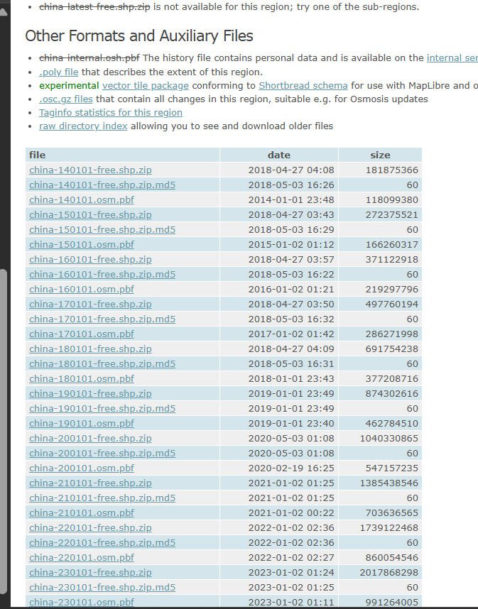 - 操作步骤:访问 Geofabrik → 选择区域(如Asia → China)→ 点击 "raw directory index" → 下载对应年份的
