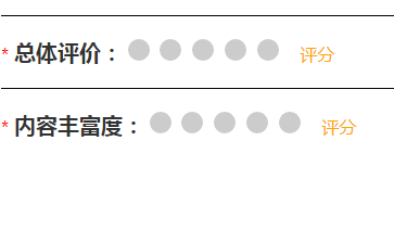 1 <!DOCTYPE html> 2 <html lang="en"> 3 <head> 4 <meta charset="UTF-8"> 5 <title>Javascript实现简单的星级评分功能</title> 6 <style> 7 .content, .content1 { 8 margin-top: 20px; 9 padding-top: 20px; 10 border-top: 1px solid #000; 11 } 12 .red { 13 color: red; 14 } 15 .total-star { 16 font-size: 20px; 17 color: #333; 18 font-weight: 700; 19 } 20 .star { 21 width: 20px; 22 height: 20px; 23 border-radius: 50%; 24 background-color: #ccc; 25 display: inline-block; 26 margin-right: 5px; 27 cursor: pointer; 28 } 29 .stars { 30 color: orange; 31 margin-left: 10px; 32 } 33 </style> 34 </head> 35 <body> 36 <div class="content"> 37 <span class="red">*</span> 38 <span class="total-star">总体评价:</span> 39 <div class="star"></div> 40 <div class="star"></div> 41 <div class="star"></div> 42 <div class="star"></div> 43 <div class="star"></div> 44 <span class="stars">评分</span> 45 </div> 46 <div class="content1"> 47 <span class="red">*</span> 48 <span class="total-star">内容丰富度:</span> 49 <div class="star"></div> 50 <div class="star"></div> 51 <div class="star"></div> 52 <div class="star"></div> 53 <div class="star"></div> 54 <span class="stars">评分</span> 55 </div> 56 57 <script> 58 window.onload=function(){ 59 var oCont = document.getElementsByClassName('content')[0]; 60 var oCont1 = document.getElementsByClassName('content1')[0]; 61 var aText1=['差','较差','好','推荐','力荐']; 62 var aText2=['少','较少','一般','多','很多']; 63 64 //调用函数 65 Stars(oCont,aText1); 66 Stars(oCont1,aText2); 67 68 function Stars(id,Txt){ 69 var index='';//使用这个index来记录星星被点击后的等级 70 //获取元素 71 var aStar = id.getElementsByClassName('star'); 72 var oStars = id.getElementsByClassName('stars')[0]; 73 74 //让全部星星变灰 75 function gray(){ 76 for(var v=0;v<aStar.length;v++){ 77 aStar[v].style.backgroundColor = '#ccc'; 78 } 79 } 80 81 for(let i=0;i<aStar.length;i++){ 82 83 //设置星星颜色 84 function starColor(){ 85 // 前两个星星显示灰色 86 if(i<=1){ 87 gray(); 88 for(let t=0;t<=i;t++){ 89 aStar[t].style.backgroundColor = '#999'; 90 } 91 }else{ 92 //后面星星都显示橙色 93 gray(); 94 for(let j=0;j<=i;j++){ 95 aStar[j].style.backgroundColor = 'orange'; 96 } 97 } 98 } 99 100 //鼠标移入变换星星颜色 101 aStar[i].onmouseover=function(){ 102 oStars.innerHTML = Txt[i]; 103 starColor(); 104 //鼠标移出变灰,评论等级清空 105 this.onmouseout=function(){ 106 gray(); 107 oStars.innerHTML = '评分'; 108 //这里必须为 === ,否则当index==0时,会进行隐式类型转换,变成 (index=='') ==> (0=='') ==> (false==false),直接return出去 109 if(index===''){ 110 return; 111 }else if(index<=1){//通过index重新设置后面鼠标移开后的星星等级 112 for(var n=0;n<=index;n++){ 113 aStar[n].style.backgroundColor = '#999'; 114 } 115 oStars.innerHTML = Txt[index]; 116 }else{ 117 for(var m=0;m<=index;m++){//通过index重新设置后面鼠标移开后的星星等级 118 aStar[m].style.backgroundColor = 'orange'; 119 } 120 oStars.innerHTML = Txt[index]; 121 } 122 } 123 } 124 125 //鼠标点击固定星星等级和评论等级 126 aStar[i].onclick=function(){ 127 // 关闭移出操作 128 this.onmouseout=null; 129 //星星等级 130 oStars.innerHTML = Txt[i]; 131 if(i<=1){ 132 for(let t=0;t<=i;t++){ 133 aStar[t].style.backgroundColor = '#999'; 134 //获取当前点击的是多少等级的星星,让后面鼠标移开后可以重新设置星星等级 135 index=t; 136 } 137 }else{ 138 for(let j=0;j<=i;j++){ 139 aStar[j].style.backgroundColor = 'orange'; 140 //获取当前点击的是多少等级的星星,让后面鼠标移开后可以重新设置星星等级 141 index=j; 142 } 143 } 144 } 145 } 146 } 147 } 148 </script> 149 </body> 150 </html>