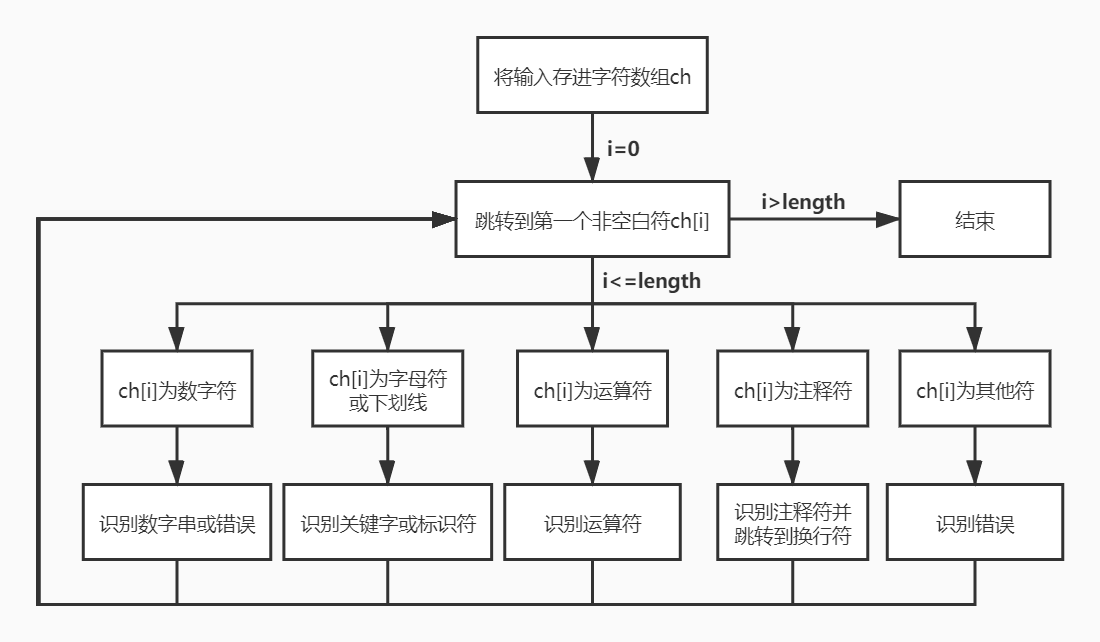 (5)X为字母符或下划线:记录此字符及其后面的字符直到遇到空白符、运算符或分界符,若记录的符号串能匹配到关键词,则将其识别为关键词,否则将其识别为标识符。