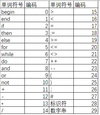 先给各类单词符号编码(见下图),以文档的形式输入将要识别的符号串,并将其存放在一个数组中,从前往后,每次根据识别到的第一个字符X做出如下操作: