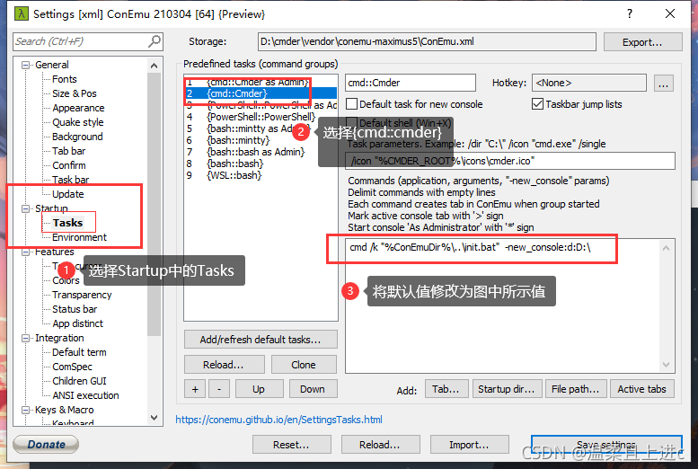 选择设置中的Startup-Task,修改{cmd::Cmder}中的默认值