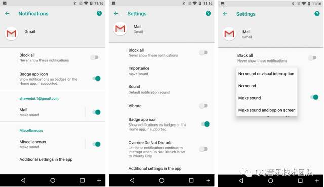 Android O 版本重新设计了通知,让通知的管理更加方便,首先引入了通知渠道用来让用户统一管理通知,当 targetApi 设置为 O 版本时,必须要实现一个或多个通知渠道,如果设置为 O 版本之前的版本,在 O 版本设备上的行为则和 7.x 版本保持一致。通知渠道提供了一种将应用内的通知变成一个个易于管理组的方法,通知渠道创建并提交到 notification manager 后,便无法通过编程方式修改通知渠道的行为,这些设置之后则由用户掌控。用户现在可以使用一致的系统 UI 管理大多数与通知有关的设置。所有发布至同一通知渠道的通知都具有相同的行为。当用户长摁通知或者通过设置去到通知的设置页面的时候,可以看到这些界面:
