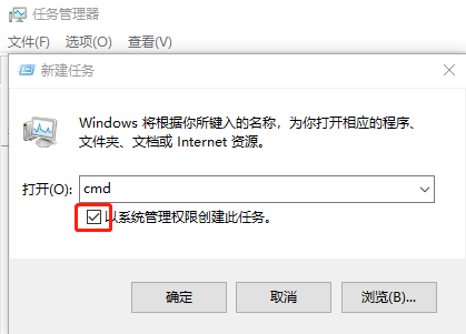 右键任务栏打开任务管理器,选择文件——运行新任务,输入cmd,勾选以管理权限创建此任务打开命令窗口,输入sfc /scannow命令进行扫描。