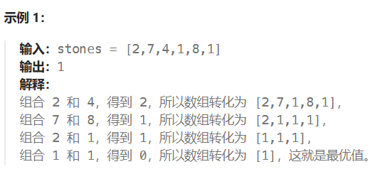 这道题目乍一看示例给的这个解题思路会觉得这怎么组合?没有一点头绪,后来看了k哥视频里讲的,这个题和416分割等和子集是差不多的,既然要求两块石头两两粉碎之后的差,那么其实可以转换为能不能定义一个sum/2,来让这些石头的重量相加等于这个数值。那么两堆石头重量的差就自然是0了