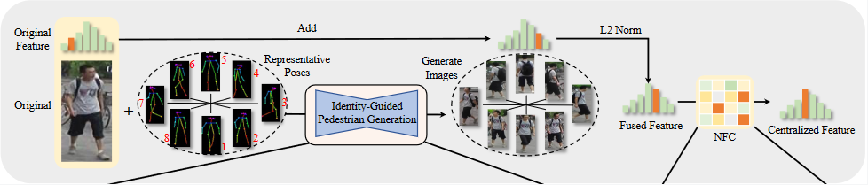 The authors proposed a Training-Free Feature Centralization ReID framework(Pose2ID), and they introduced two components: Identity-Guided Pedestrian Generation and Neighbor Feature Centralization.