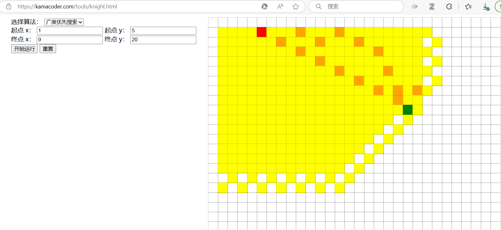 其实可以从上图看出,广搜会搜到大量的没有用的结点黄色的,而相比较之下。A*的搜索就比较有导向性了。