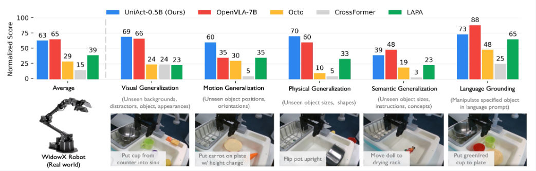 What’s more, the authors compare UniAct-0.5B with ACT decoder after fine-tuning and LLaVa-OV-0.5B. Eventually, the Uni-Act get better performance.