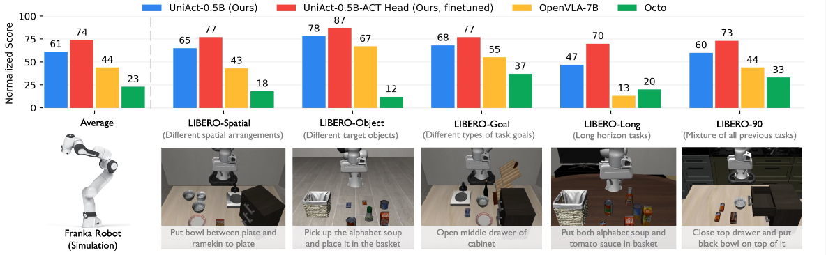 They also utilize the LIBERO Benchmarks for evaluation in 130 tasks. Finally, UniAct significantly enhances task performance on the LIBERO benchmark.